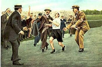Petri fell four times and was helped back up by “umpires” on all occasions, depicted here being pushed across the line – will this London Olympics marathon finish in a similar way?
