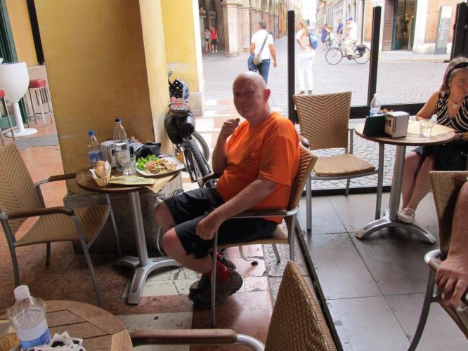 Got away late for reasons in the picture below, but managed 50 km before lunch in the centre of Modena. Lots of history here, dating to 218 BC and an invasion by Pompey. Lamborghini headquarters provide employment these days so it’s not the hardest hit Italian city.