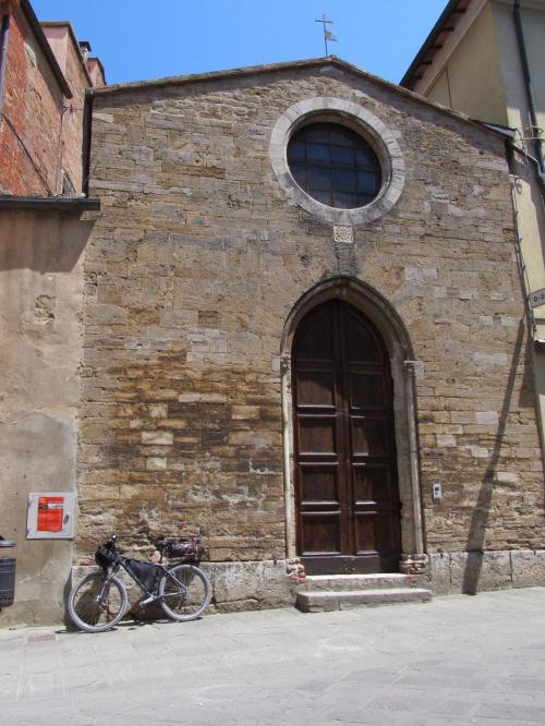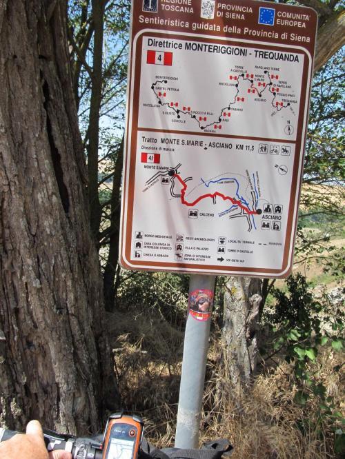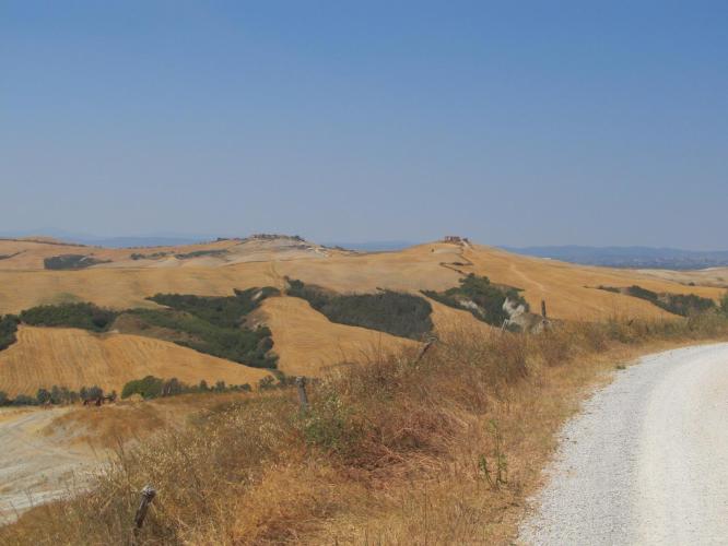 The sceney changed from the forested hills and vineyards in the north of Tuscany at Radda, to fields of wheat being harvested and more vineyards as I headed south. Encountered the best section of biking so far on a 25 kilometre off-road route between the A1 autoroute and Asciano. Good to leave the road bikes behind. It was certainly rough.