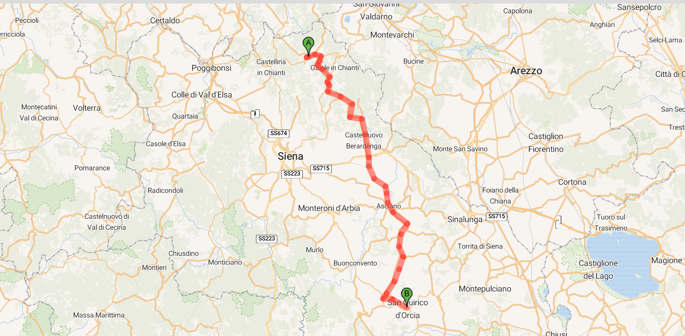 Left Radda at 9:30 hrs, lunch in Asciano at 13:00 hrs for 40 minutes. Several necessary stops in all the villages on route in the afternoon for Agua Frizante, it was pushing 35 C. Arrived at San Quiroca at 16:45 hrs. Max speed 54.7 km/hr, Moving average 15.6 km/hr, Moving time 5 hrs 1 minute. Altitude here 442 metres, height gained during the day 1067 metres.