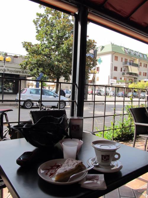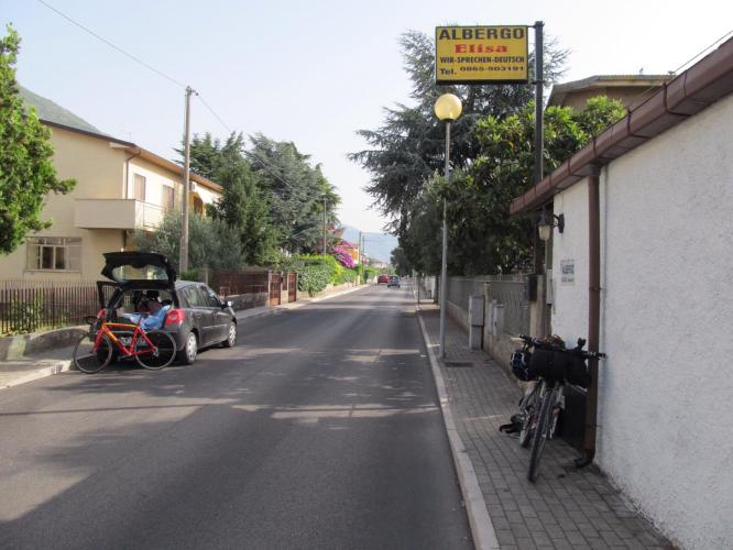 Last night’s Pensione – not strong – couldn’t swing a dead parrot the room was so small – no flush on lav – ac didn’t work – another biker was staying, with his wife to carry his stuff (!) – and only riding 5 days.