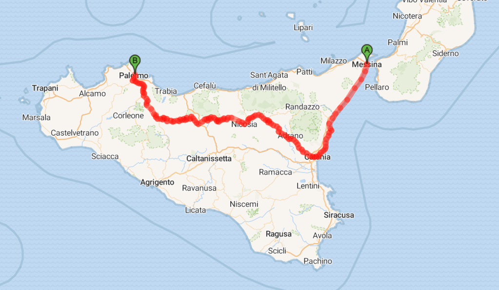 Distance 31.5 km, Max speed 47.0 km/hr, Moving time 1 hr 48 mins, Moving average 16.5 km/hr, Left Meri at 10:15 hrs, arrived Palermo at 12:35 hrs. Elevation gained 207 metres.