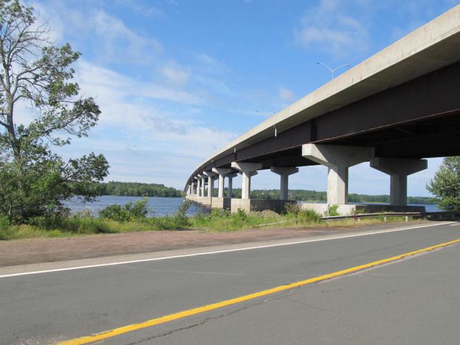 This is the Trans Canada highway crossing the Jemseg River. The Jemseg river flows out if Grand Lake, south to the ocean.