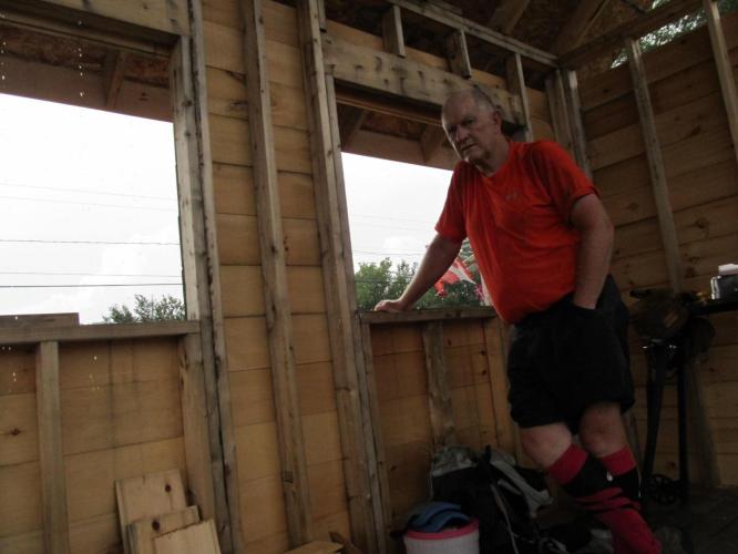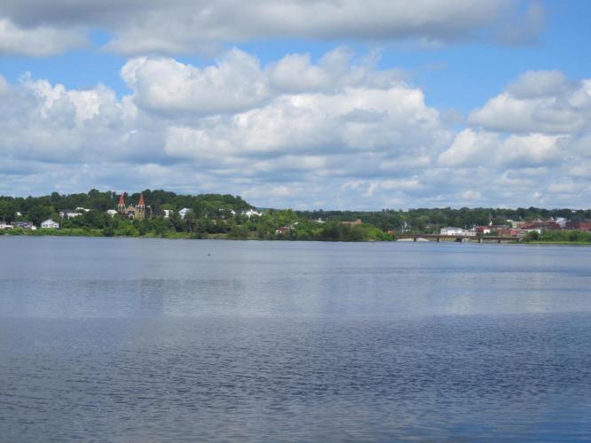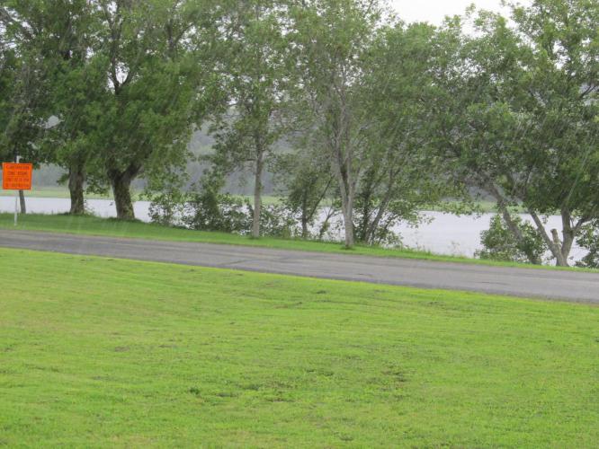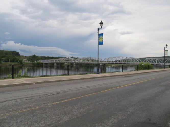 A drink break here and onwards and north westwards on the 105 and the right bank of the St John to Florenceville. There were now heavy storms, similar to yesterday but heavier rain with more thunder and lightning. I was ready to finish and rode up the hill to the motel. This is where the headquarters of McCain foods is and the motel was a smart hotel. For too posh for me. Back down the hill 3 k and on through Bristol and Bath. At Bath having just sheltered from a storm, and with another threatening I was about to camp. The next town, Perth Andover was 35 km+. A late change of mind though, and I decided to go on. It is the Sunday of a long weekend (Monday is New Brunswick Day) and many stores and restaurants were already closed. At the top of the hill 2 km out to Bath I had a puncture just as the storm hit.