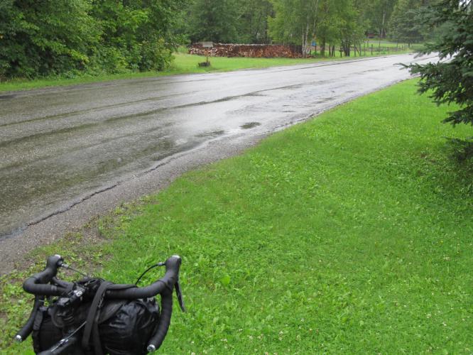 Puncture number 4 – I was anxious to check it had nothing to do with yesterday’s, 50 km ago, and it didn’t, a thorn in tyre not easy to get out with teeth as worn as mine. An advantage of the rain is the useful puddles to find the hole.