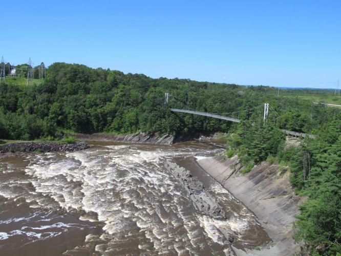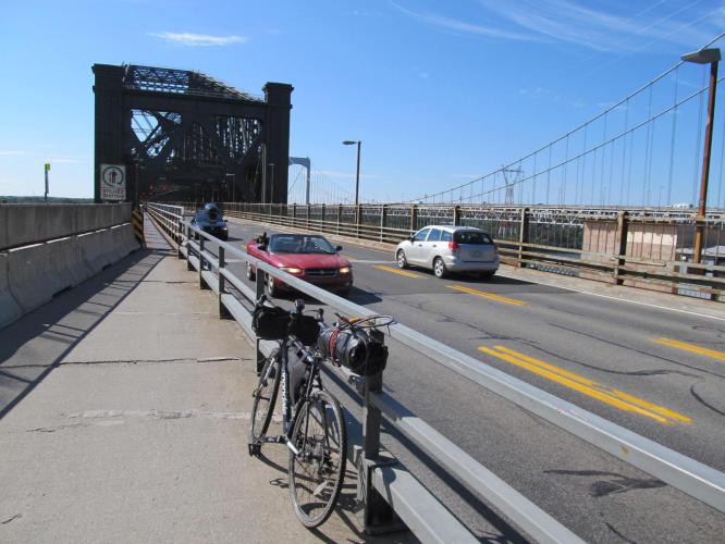 Quebec City must rank as one of the best cities to ride around, and certainly to leave by bike on the routes I chose. Spectacular riding over the St Lawrence bridge and through the southern suburbs, and then over the St Nicolas suspension bridge before hitting Route Verde 1 again. But Route Verde 1 comes into its own now and is a former train line and practically never today shared with the road. The problem was the south westerly wind from yesterday remained, at 20 – 25 mph, right in my face all day. Any frustration as to he shale surface of the track were quickly scuppered as most of the time the trees surrounding the path gave some protection. See the map also, it is almost completely straight. It gradually gains height, Quebec was at sea level, and here is at 168 metres. The distance therefore on the route verde is less than the road.