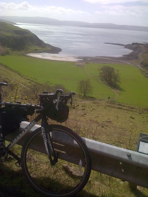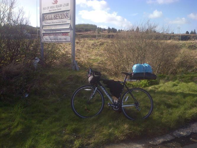 I was the only passenger on the Mull ferry. 30 minutes into Tobermory. Straight away there is a reminder that it is Easter vacation and tourist time. Tobermory was busy with visitors, it’s pubs, Indian and Chinese restaurants – seeming like a different world to the islands I had come from. Hence the decision to ride directly out. That, and the fact that the wind had veered round to the north west. The 22 miles south along the east coast of Mull covered in good time, and I arrived into Craignure at 5:30 pm. It didn’t look like there was anywhere to camp for free, and certainly not that was sheltered at first glance. The campsite wanted a staggering £12:50 for a tent. Slightly out if town to the south is a castle gardens. Option 1, ideal really. Close to the Craignure Inn, that was packed full of tourists. Option 2 was to ride back north a mile, from where I had come, to the Isle of Mull Hotel which has the islands swimming pool next to it. At the back of the swimming pool was a good area of grass. Perfect. Dinner and a couple of beers in the hotel after a 100 km + day.