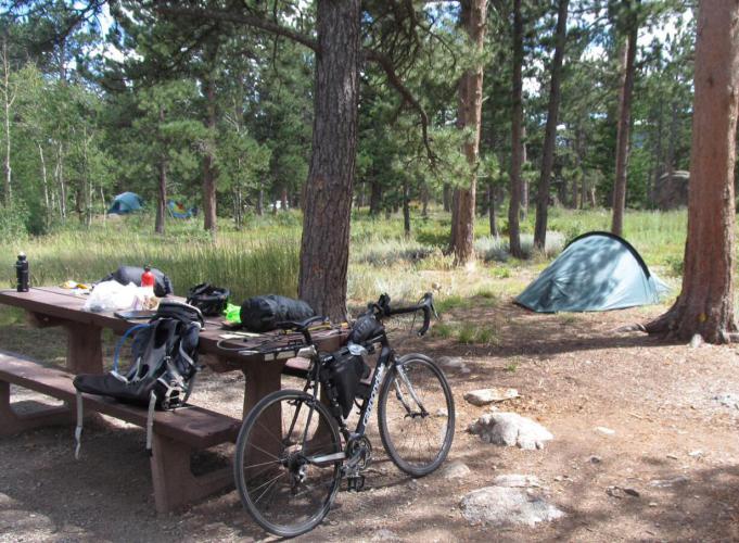 It is the last weekend before the schools are back and pretty much everywhere is busy. In the Visitor’s Centre I struggled for half an hour to find any information on camping outside the Rockies Park. Everything is of course geared to having a car and being able to get off the route easily. Gone is the hiker-biker sites that always have room and at greatly reduced prices, common in Montana and Wyoming. I found a State Forest site called Olive Grove (no idea why), and headed for there. These are first come first served sites, and by chance, one was left. It seems a great site, not large, lots of shade, quiet, and a mile or so from the village of Allen’s Park.