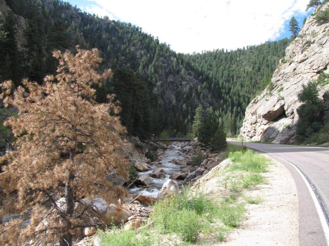 I have learnt from previous bad choices for finishing places (Calais, John O’Groats, Palermo, Portland Maine, Malaga) and today’s riding and finish place was exceptional. After 6 miles of big rollers the highway 36 turns north east away from the Peak to Peak and descends down St Vrain Canyon. In 14 miles it loses almost 2,500 feet with magnificent scenery to boot. At Lyons the road turns south and heads over the rolling Flatiron Foothills into Boulder.