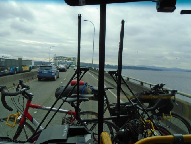 On the 520 bridge out of downtown Seattle