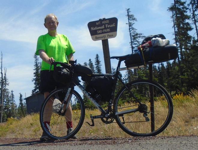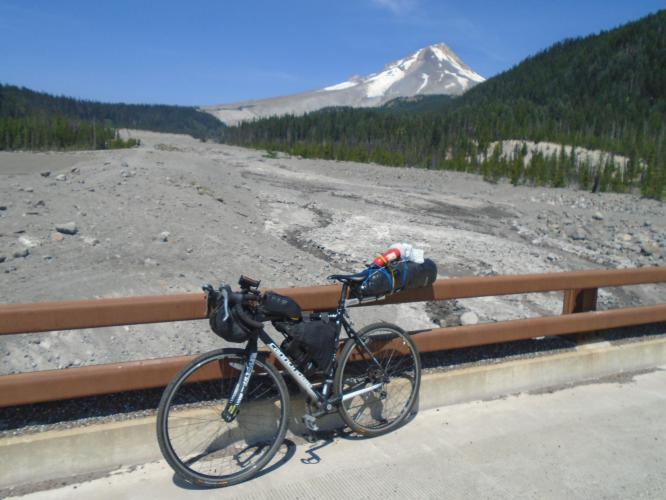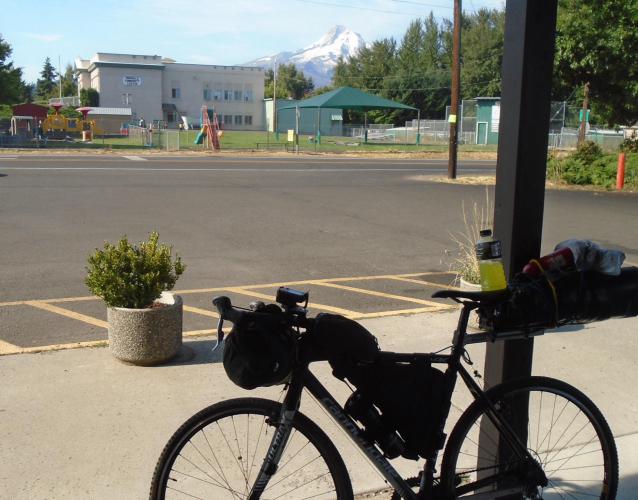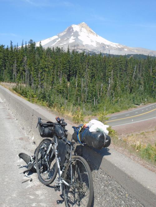 I had a cheap motel to get some clothes washed and stay out of the heat for a bit. Again yesterday it went up to 39C and today in Hood River was forecast for 40. With that in mind I was away at 7, taking the backroad, the 281 or Dee Highway out of town and to Parkdale about 17 miles away. This is a quiet village and prefect for a stopover night for anyone wanting a leg up the pass, as its at 500 meters asl. Having moseyed along through fruit orchard from Parkdale the real ascent begins. Though for probably another 10 miles it’s only at 4%. The traffic wasn’t too bad and there is always some decent shoulder (not so before Parkdale on the main road though). The last 6 or 7 miles are steeper and the temperature was rising fast. I was at Bennett Pass (1428 metres asl) at 12:20 pm, 4 and a half hours of ride time, 37 miles, mostly of ascent. Slow but steady.