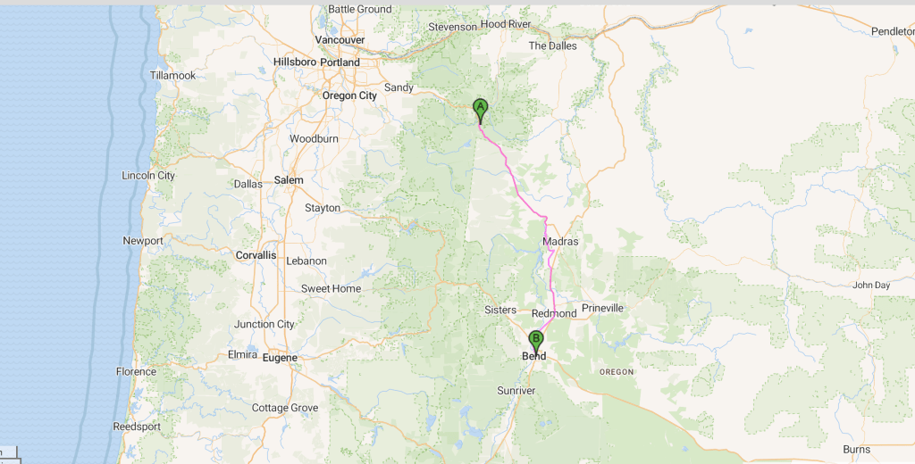 The easy route out of Pelton is back to the highway and up the 5 miles at 5-6% to the desert plains again at 800 metres. The quiet way is up the little road that continues along the canyon and goes up 2-3 miles at 9% and sometimes steeper. I took the latter and until Metrolius only 2 cars had passed me. After a slow 17 miles the quiet roads join highway 97 just after Culver. From then it’s a reasonably fast and boring ride through Redmond into Bend, climbing steadily all the time.