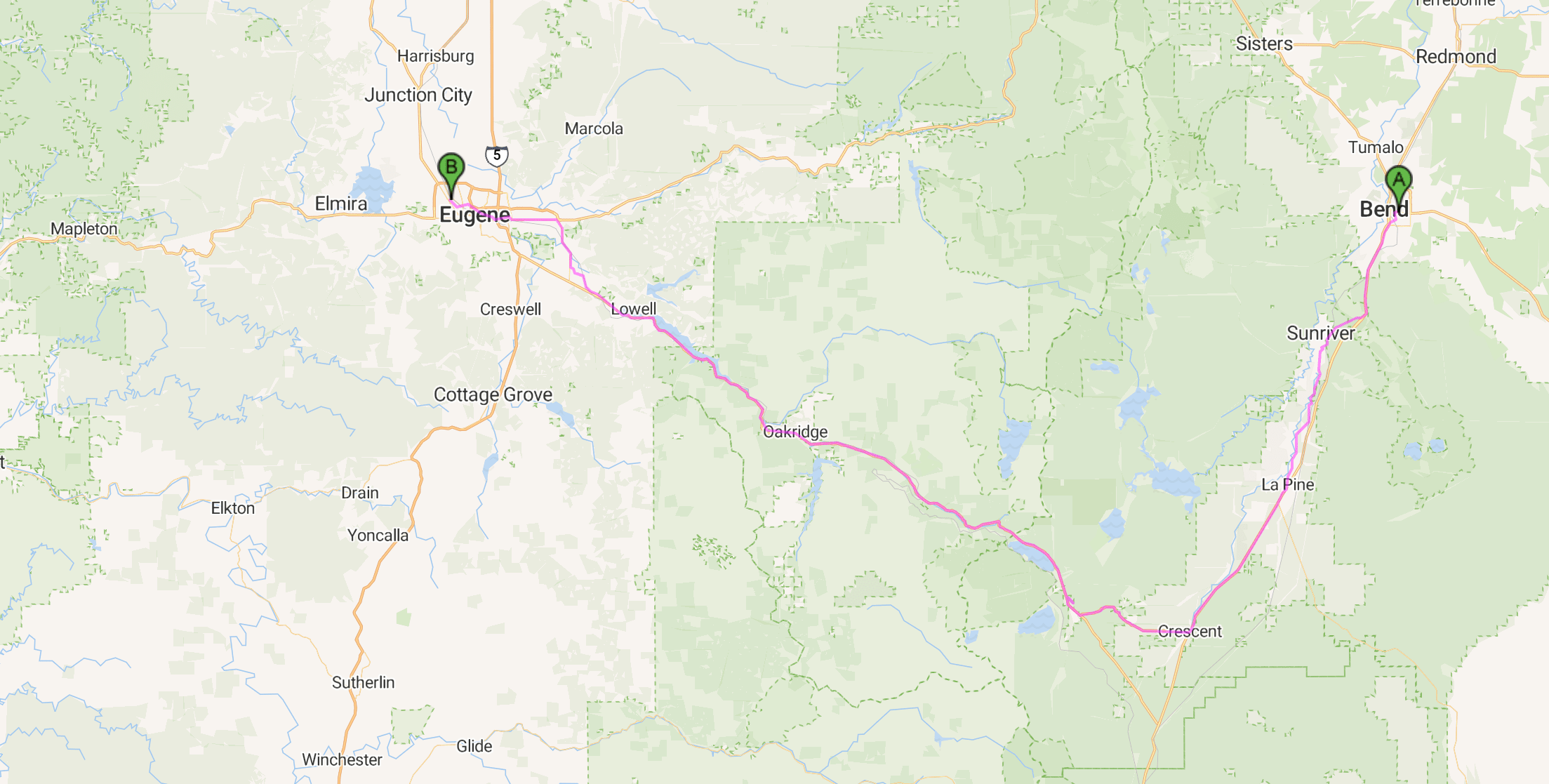 I avoided some city riding today by using the Oregon bus bike racks. I got out of Bend to Gilchrist and so enjoyed the best of the cycling in the Deschutes Forest, then got on the Eugene bus and bike rack and Lowell, making the day manageable. In fact, after the Willamette pass, there was 800 meters of downhill.