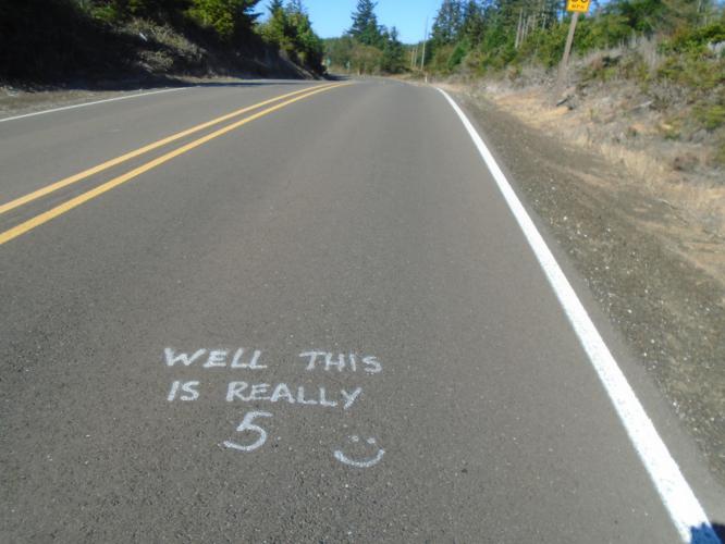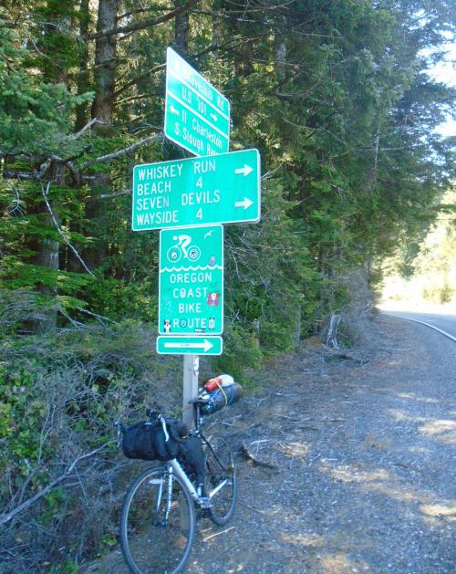 This morning’s ride away from highway 101 on the Seven Devils road was excellent and highlight of the trip. The ‘Devils’ are the steep hills encountered on the road, each about 80 meters and ranging from 7 to 12% in gradient. Good that they were in the morning, as it is cool at that time, 15 – 20C. It soon heats up though, and mid afternoon despite being in the coast was almost 30C, not quite what the Cascades were like though. After about 15 miles it is back onto 101, and very similar terrain to yesterday; forested, ups and downs, busy traffic, shoulder usually decent except for a section just after Langlois. The isn’t much in either town, Bandon or Port Orford, but I did get a decent sandwich in Port Orford and the test match score, which livened the day up considerably. After a supermarket stop it was on the 5 miles or so to Humbug State Park, and what seems and excellent hiker biker area.