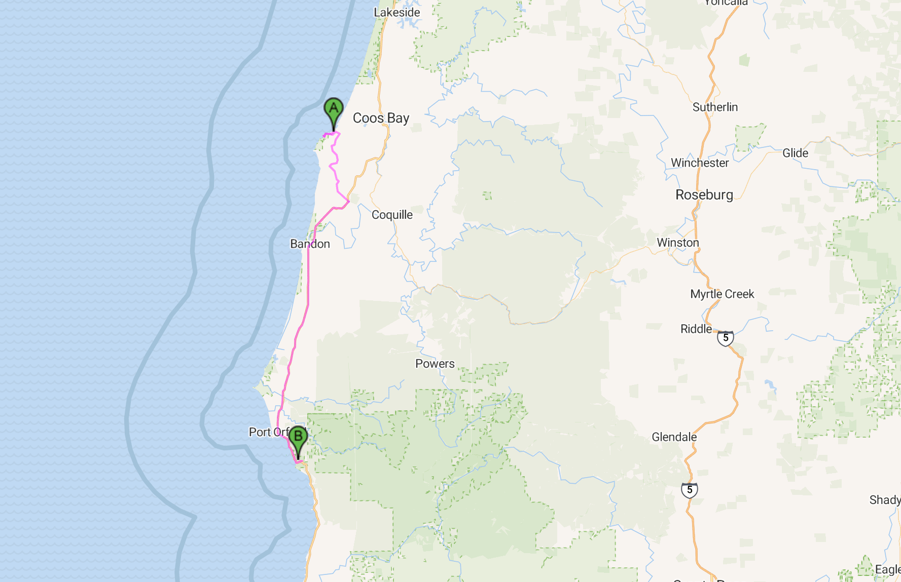There is quite a bit of cyclist traffic heading in both directions on this route. The CGOAB site has at least two other sets of riders on it. The people I have met have either been students on a type of coming of age experience, or crazy. Last night in the HB area there were 5 others. One very young (I guess 19) Californian lad who has just started in Bend and is headed to San Diego, then back up the Sierras to Crater Lake and Bend. Two guys from Berkeley University who are mid 20s and started in Vancouver, headed west on the Olympic peninsula (I went East) then down the coast back to Berkeley. Also a young couple (again I’d say mid 20s) who are just on a 2 week trip, from Newport to Crescent City, and a rental car to SF. Of the crazy type, I rode past 2 young guys on the Cougar Pass who were walking and obstructing a fair bit of traffic. They clearly were headed for the beaches. They had a large ghetto blaster type player on a rack at the front of the bike, blaring music out, and beers in a cooler on the back, as well as panniers with tent etc. Today headed up the hill into Port Orford and into the strong northerly was a guy about my age, walking, and ‘riding for Jesus’ on a scruffy paper made with felt pen at the front of his bike. Jesus wasn’t on his side today.