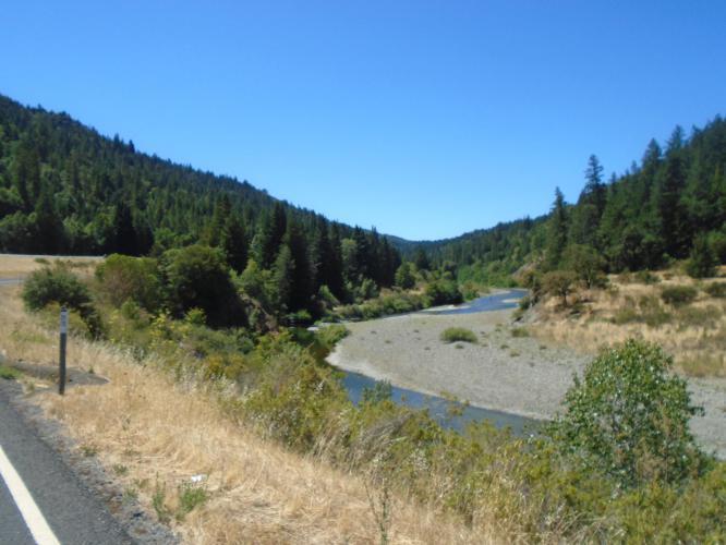 The late morning then brought hills, the biggest yet along the coast, up and down to 250 meters from 100 metres quite regularly. Since Rio Dell the route has been following the Eel River upstream.