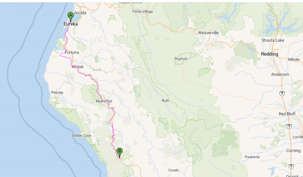 This morning was the remainder of the ride on the Avenue of the Giants, no big hills and the huge redwoods ensuring shade from a clear sky and a hot day. After a coffee at Miranda it was back on to 101 for some miles to Garberville. It has been surprisingly difficult in the last 3 days to get internet access here, and I resorted to hitching into to someone else’s signal while in the shade in a fuel station. The cafes didn’t have it. Garberville is the biggest place for some distance.