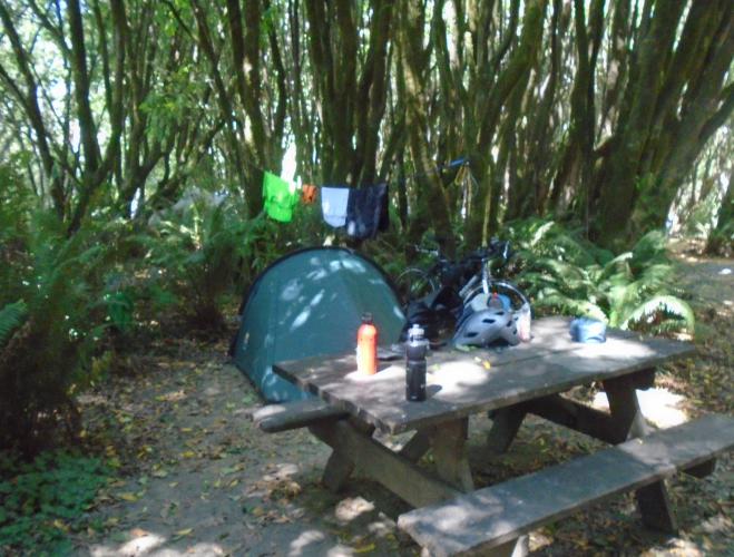 Last nights camp was busy with Pacific Coast cyclists. The Chilean girl, a French Canadian girl we have been riding with on and off for about 8 days, and the fast American girls who is always ahead of them. Also a guy from Houston who has ridden up the Great Divide MB route and is returning on to LA on the coast. They think I’m crazy to ride back so far to the pub.