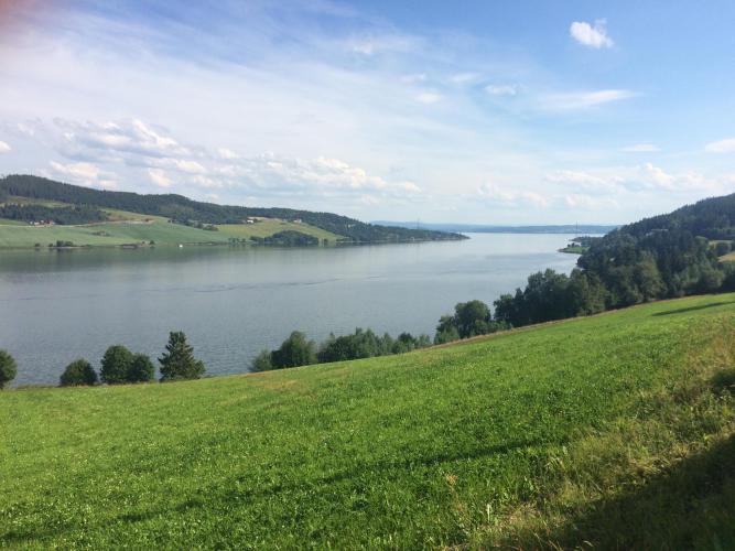 Despite being lighter I found it tough today. The RV 17 leaving Namsos for pretty much 50 kilometres is busy (it is not a minor road), and far less attractive cycling than yesterday, and by lunchtime the temperature was late twenties. Hilly also, long drawn out affairs. At one stop off rest I chatted to an older Norwegian guy who was headed down to Trondheim for Bruce Springsteen tomorrow night. 35,000 people in the ski jump stadium. Few big names have ever played Trondheim until a couple of years ago, but now it seems is on the circuit.