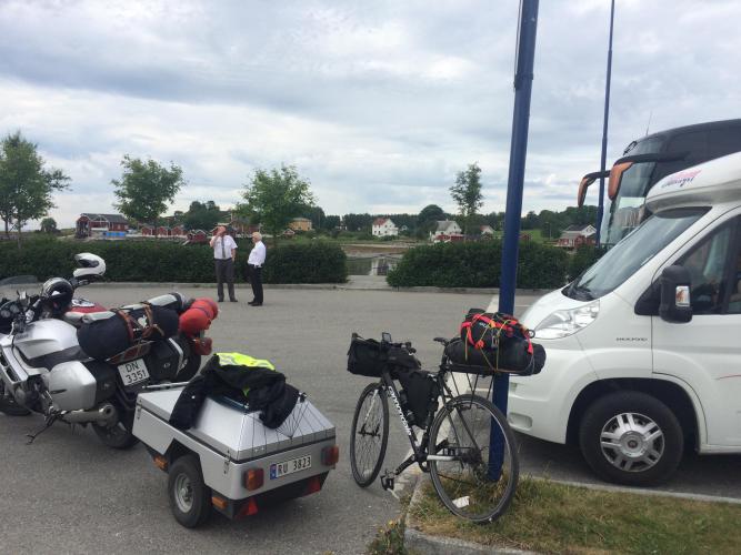 Another short crossing of 20 minutes to Holm. From the ferryman at the Holm kiosk I realised I had missed the supermarkets. I had been misinformed that there was one in Vennesund. The ferryman recommended a campsite though and said there would be some food. A top recommendation. After the only big hill of the day, a steep rise to 110 metres and the downhill there is a guy with a little shop, cafe and space for just a few tents, no hook-ups and therefore no caravans or motor homes. Just me and a lone older Dutch cyclist heading north here tonight. We had dinner together in the cafe, meatballs, potatoes and mushy peas even. It’s quiet here, and I may even get to bed before 10 pm.