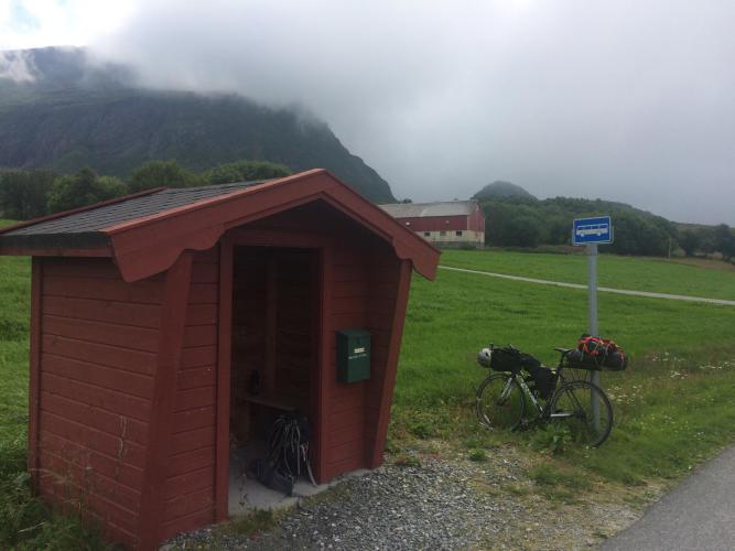 Norwegians love their bus shelters. They are usually named and decorated with hanging baskets and maintained by the community. This one makes a great lunch stop – out of the south westerly wind that is in my face all day, and it’s not warm… 14C