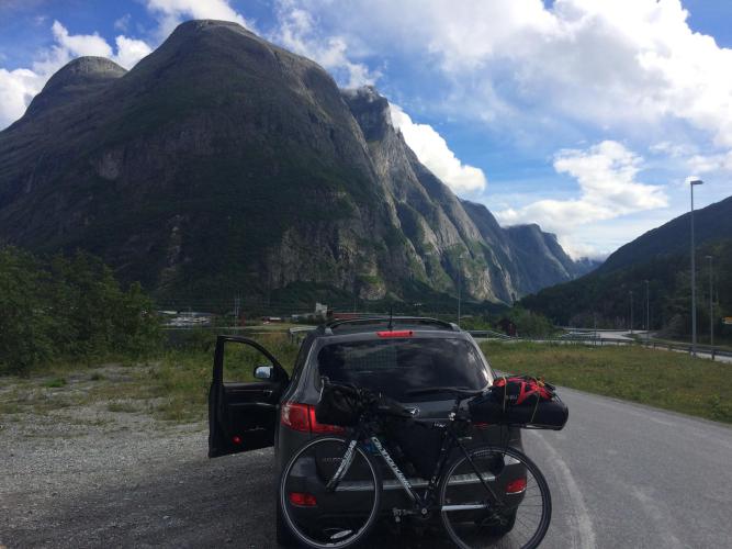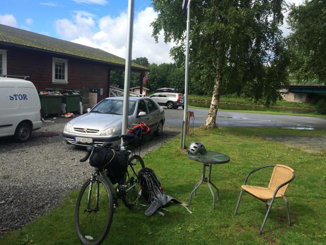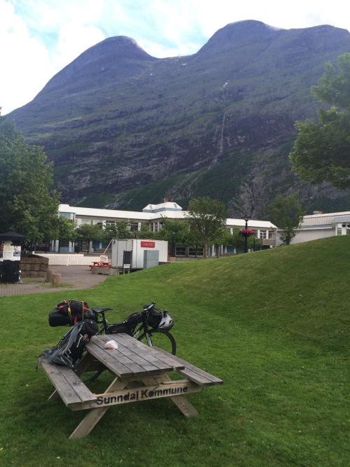 Though I awoke and was out of the tent just after 7:30, the rain soon started. I am ahead of my schedule, so I resorted to a quiet morning if reading and coffees. The rain stopped, blue skies in its place. And I was away just after 1 pm. It was up and over a hill to the Kvanne ferry, then up a somewhat bigger hill towards Sunndalasora. Short of the town by 10 kilometres and I cam across at 7 km tunnel that had no cycling allowed in it. Just as I pulled over a 4WD Honda stopped by me and told me he would take me though it. The guy works in the aluminium factory in town and was out with his dog, an English Spaniel, in the hills. He had only las week written to the local newspaper about the problems this tunnel causes for cyclists. There is no realistic way around it. If cyclists go through it, they are usually reported by a motorist, and the tunnel is closed, with a hefty fine for the rider. The only thing to do is to wait and shout down a bus as it infrequently passes (maybe 3 times a day my driver said), of hitchhike. I was lucky.