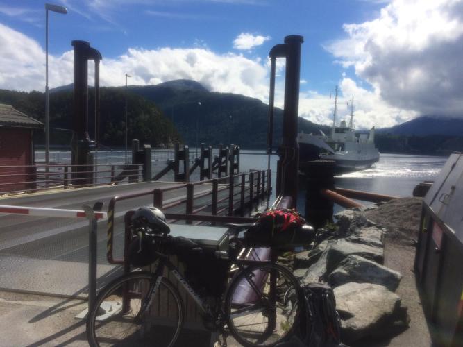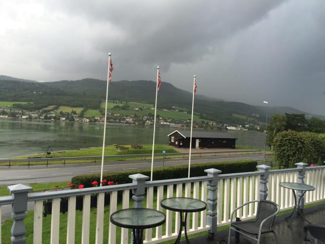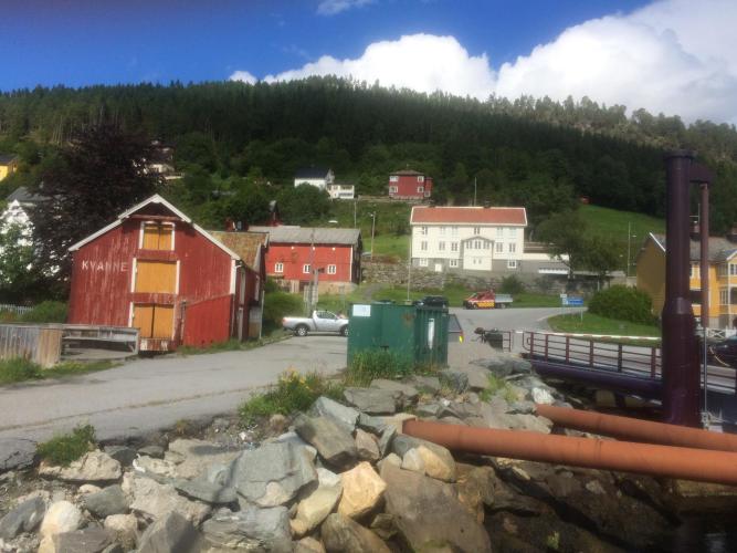 From here the road travels around the fjord and through 3 tunnels, each about 2-3 km, before climbing the hill inland and descending to Eidsvag. Just as some heavy showers arrived I searched for the camping. Locals pointed me one way then the next, and the GPS appeared wrong. Actually it closed a couple of years ago (Stobo camping). There looked some good places on the river leading to the fjord but a taxi driver told me the police moved people on. As a particularly heavy shower arrived I decided upon the B&B. The price included spicy cod and potatoes dinner which clinched it for me. What I purchased in the supermarket can wait a day. A little bit of luxury every once in a while goes well.
