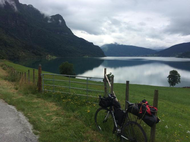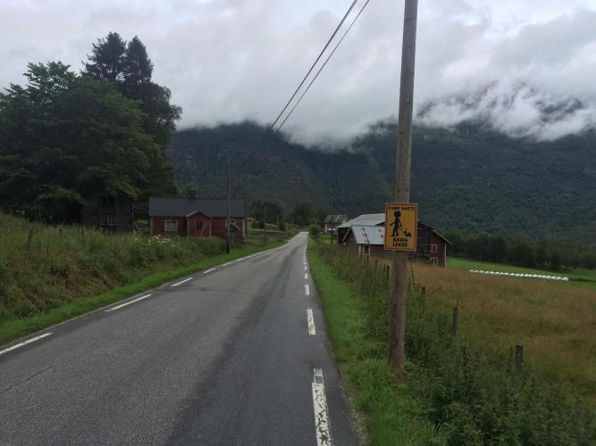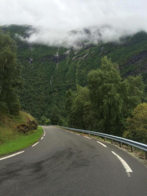 I had two options this morning, one to go over the hill to Ovre Ardal on the little mountain road, which gains 500 metres immediately into the dense cloud, or the other to descend to the fjord at Fortun, the slightly longer way round. With the rain and cloud as it was I descended. It’s not easy descending 900 meters in the rain at 10% gradient on wet roads, add to it the smell of burning of car brakes and clutches. So it’s slow going.