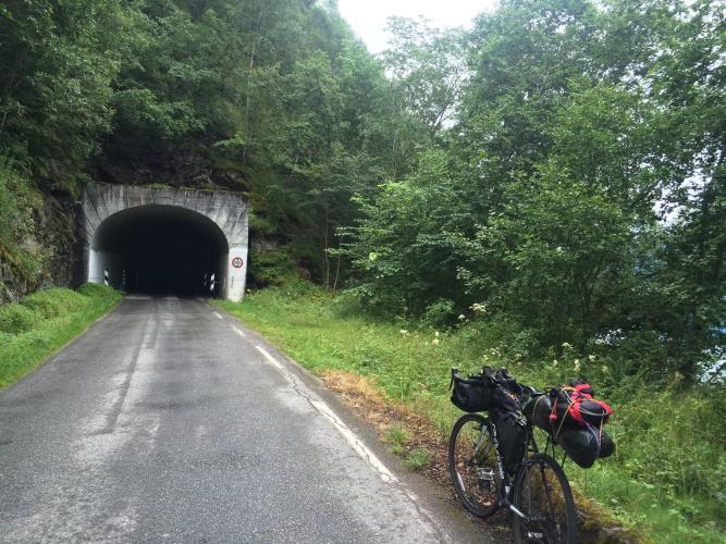 From Fortun there is the option of the small 331 road on the opposite side of the fjord to the main road, a much better option. It heads 31 km to the Stave Church at Urnes and there were practically no cars on it. Also it goes through 4 unlit tunnels, up to 2 km long, completely dark, very exciting. From Urnes there is a little private ferry across the fjord, then a steep uphill, and the day changes…it joins the very busy pure 5 which at Sogndal becomes E17 for probably 20 kilometres to Kaupanger, and up some decent hills. Not a lot of fun with hardly any shoulder and lots of traffic of all sorts. However, the last 7 km is a downhill to the ferry and the last 3 of those are through a downhill tunnel. Good fun.