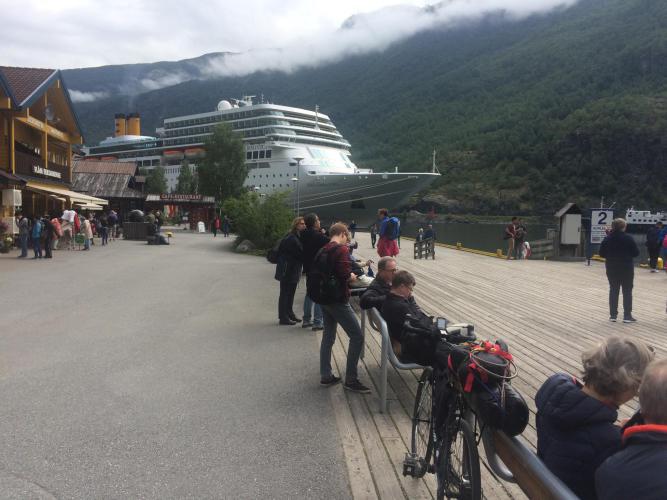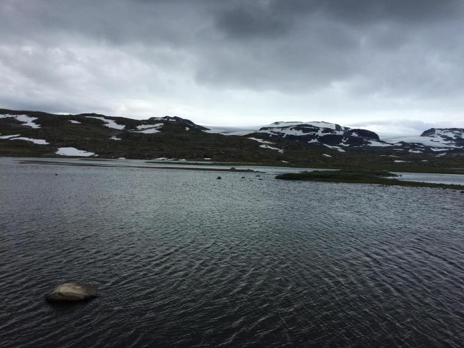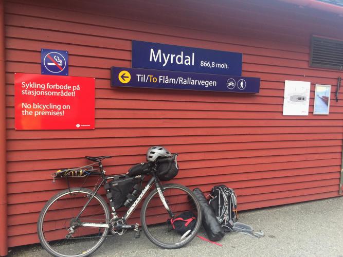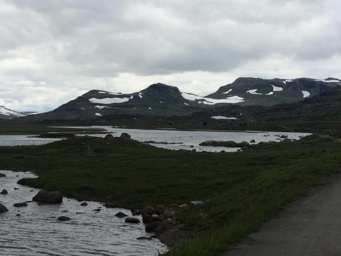 I finished a book before heading out of Flam on the famous railway up to Myrdal. A million tourists travel on it each year. Many of the views that the train stops at are certainly spectacular, but matched in the last few days riding. At Myrdal it’s a change to the Bergen train for a short time to Finse. Finse is famously at 1222 metres. The hotel is called that, and a recent crime thriller also (Norwegain author Anne Holt, worth reading for sure). There are no roads, just the train station and a few 4x4s. There is some cross country skiing in the winter, but a lot of snow around. There’s 27 kilometres of riding on the Rallarvegen and a loss of height of 200 metres to Haugastol. From there it’s the busy road to Geilo, which has a surprising few hills as well as losing another 200 metres.