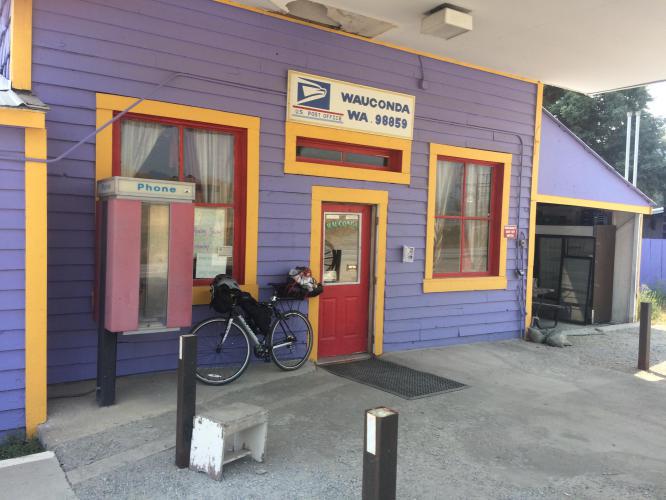 It’s 24 miles to Wauconda, though the road climbs, it crosses a plain, which by the time I got there was in the 30s, hot. From Tonasket this is a climb of about 1100 metres. Running low on water it was with some considerable delight incam to the ‘town’ of Wauconda. It’s one building, fortunately a post office / store, and was open. The ‘store’ title is earned by some self serve cold drinks with an honesty tray of 75 cents. Luck, because that was all I wanted. It’s really just a post office these days, a place for local ranchers to come and get their mail. From here it’s 3 miles and another 200 metres up to the top of the pass.