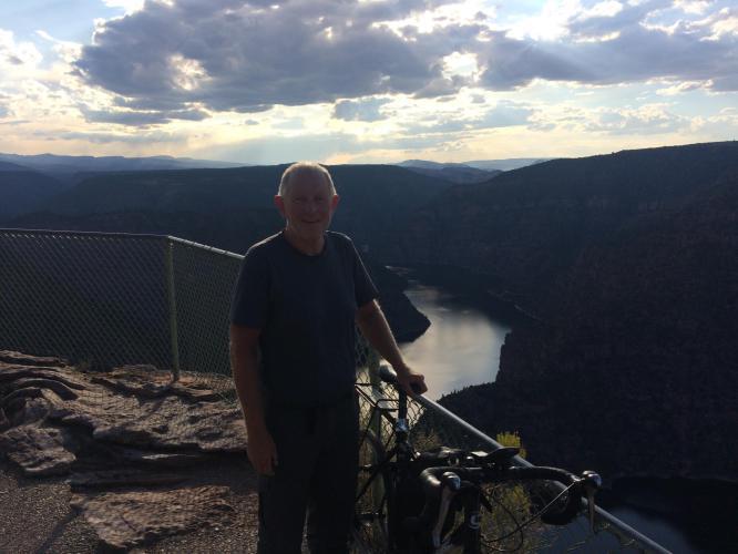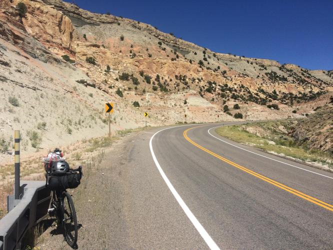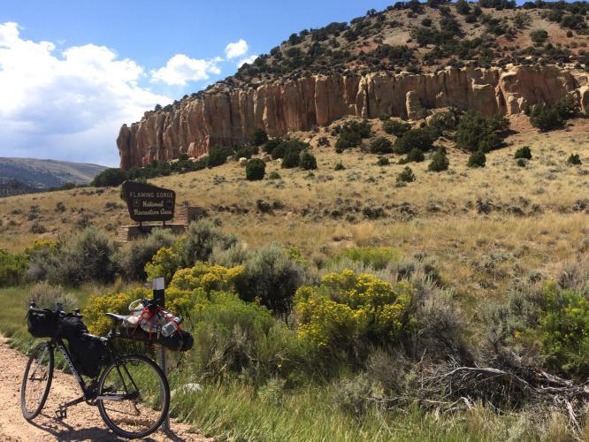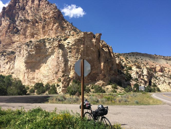 At Manila I picked up some lunch and filled up water, as from here the climbing properly starts headed into Flaming Gorge. There are two cruel hundred metres hills with 8-9% gradients to enter the Park. Both descend back to 1900 metres. I thought of stopping for the night at this point, there are campsites, but decided to go on. Several times in the next 3 hours climbing I regretted that decision, but on arriving at Red Canyon was rewarded by spectacular views, a virtually empty and peaceful campsite, and the best food yet at the Red Canyon Lodge restaurant. Schools are due to start back in Utah this week, so the campers have gone home until Labour Day weekend at least. Having put the tent up I cycled 3 miles to the canyon look over point, the had a very good soup, chicken pasta and apple pie dinner. It was a long and tough day, but just that bit easier after a motel night and quick start in the morning.