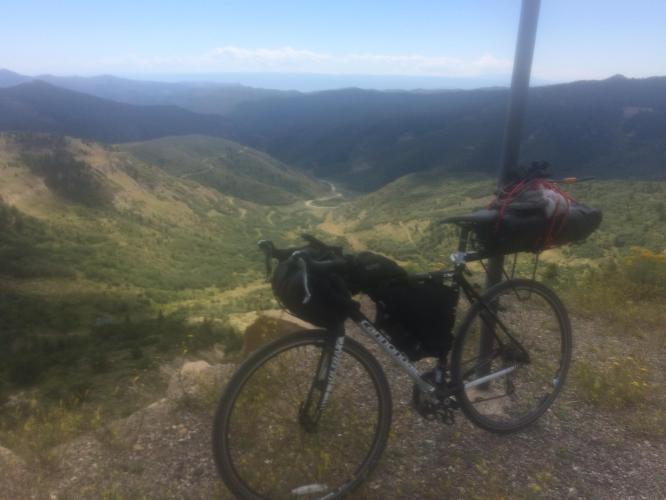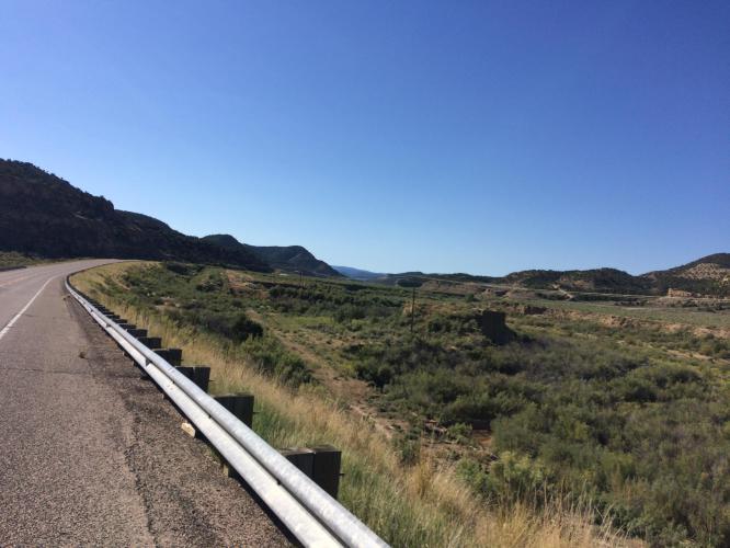 After a Breakfast Sandwich and coffee at the cafe in Rangely I was away south on highway 139. The road followed a dried up river and very gradually climbs for 35 miles. It was very quiet and pleasant riding with the desert scrub scenery of this part of Colorado. Then the road climbs much more steeply for the Douglas Pass. It’s about 400 metres climbing in 3 miles, and tough in the midday hear. I got to the top at 1:15 , a bit later than I had estimated, as those last 3 miles were pretty tough with a loaded bike. The downhill is pretty similar, and straight away I was aware of the poor quality of the road. It’s pretty important when you’re doing 30+ miles per hour. There are some pretty good views from the top. A section had suffered a landslide overnight, but it was mainly sand and small rocks left on the road. Similarly to uphill, the steepness levels off and provides a very quick last 20 miles, except for a few jumpy little hills.