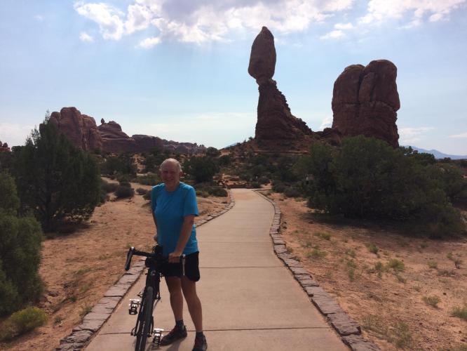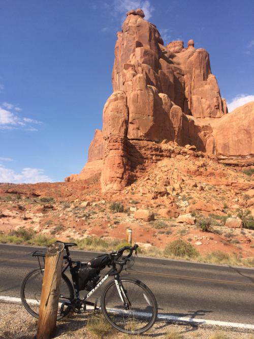 I’ve been in Arches National Park today. It’s wonderful to cycle without most of my gear n, which I left in the Lazy Lizard Hostel. I managed to get going for just after 8, as the temperature is forecast to hit 38C this afternoon, and I was back for lunch at RedRocks cafe just after 12. It was some fanatastic riding.
