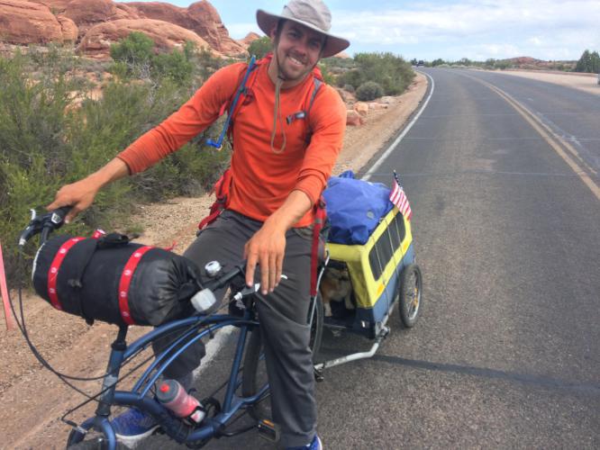 Chris is cycling from Florida Keys across the US, and the reason I spoke to him and took his photo, is that his dog is with him, in the trailer.