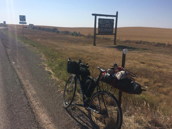 5th puncture of the tour. I had been repairing it and Andy from Germany turned up, riding the opposite was, from New York to San Francisco in the ACA route, the Weatern Express.