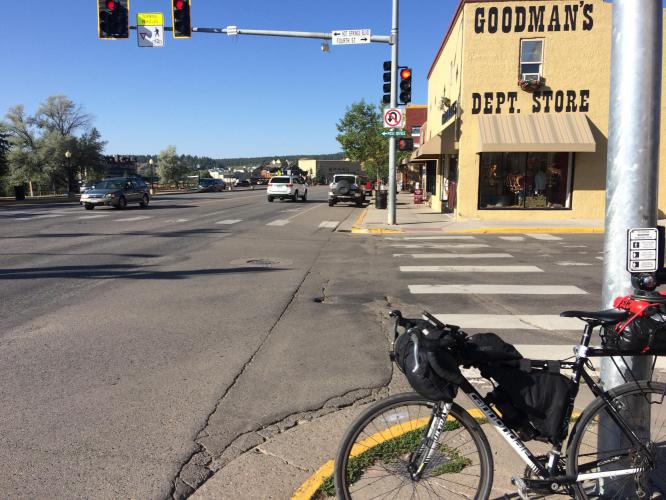 It was the ride of the Three Little Devils, christened by me. Three sharp uphill bursts, then lots of ups and downs. The screenshot if from Doogal. A good tool if you’re looking for an elevation profile of what you’re about to ride. Maybe you’d prefer not to know, that way it could be a nice surprise. It actually is surprising that you can climb more than 1100 metres in a day like this. The riding is amongst the best of the course so far though, and that’s despite the traffic. Entering New Mexico the forest is replaced by alpine meadows, but the mountains surround throughout, it really is a splendid ride.