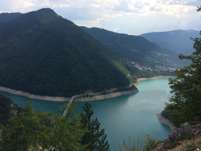 The descent is hugely spectacular – 1100 metres down to the Pluzine Gorge and reservoir.