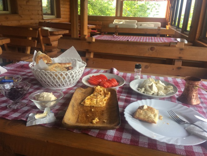 Breakfast at the Pension Umoljani. All local produce; jam, honey, eggs, cream cheese, homemade bread, and Bosnian-style coffee.