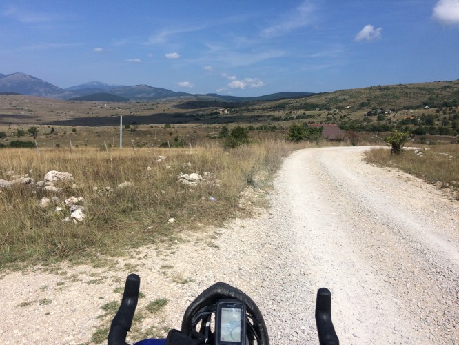 The R402 descends to Drvar town, then the only big climb of the day, up 400 metres out of town, on a busier and sealed road, but still only moderate traffic.