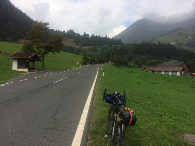 But first it’s up steeply, 500 metres in 7 kilometres., the first two at 10-12%, hard work with a loaded bike.