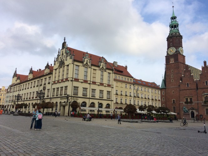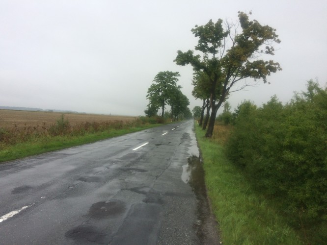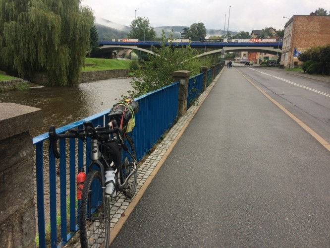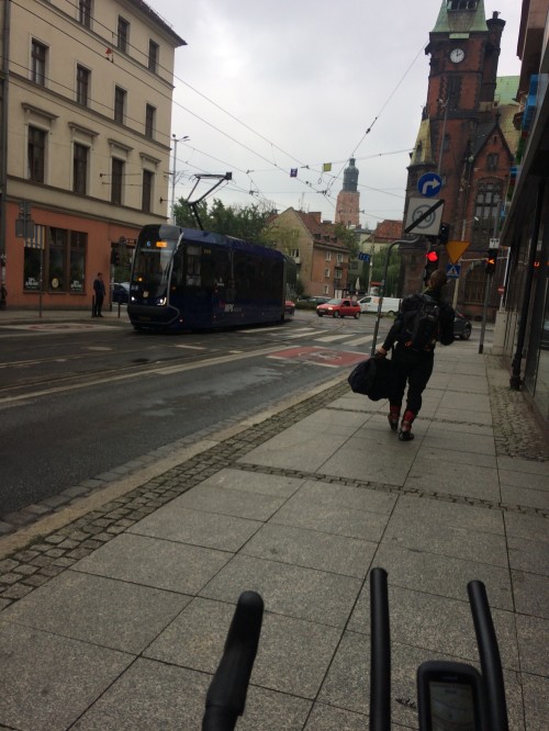 Much of the fun riding was over for the day, but there was still some height to lose, and the roads I took were still quiet, so it was pretty fast and very wet until the suburbs of Wroclaw, then a bike path / lane into the city.