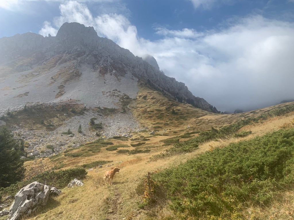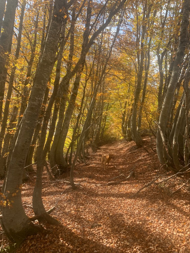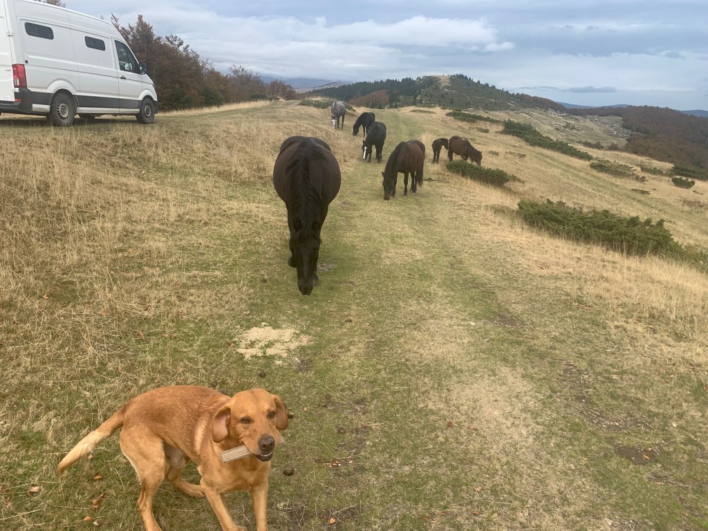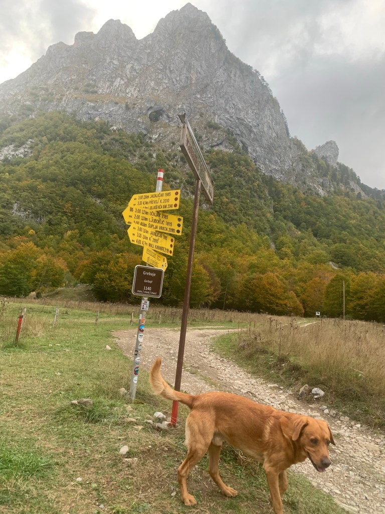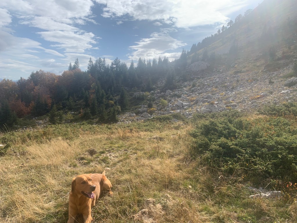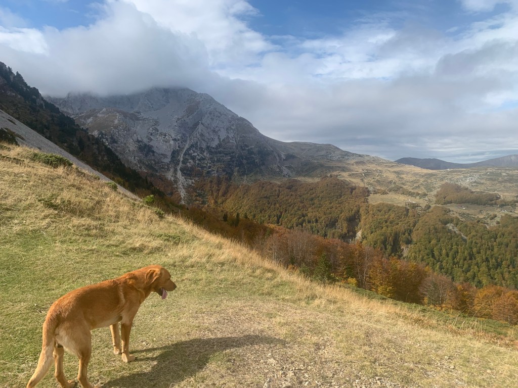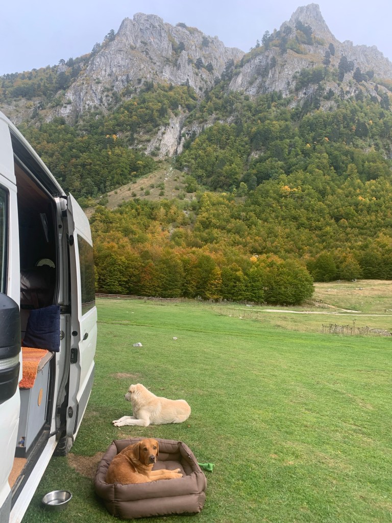 There’s a 3 euro daily fee to enter the National Park payable at a booth just before the village of Grebaje, the same name as the valley. The village was originally just a couple of shepherds’ huts, but now has quite a tourist development of cabins, holiday homes and a couple of restaurants, all empty now as the season concludes, though I guess a few visitors may be around at the weekend. Just out of the village is a meadow where camping and vans are permitted. There was one other motorhome there, a Belgian guy with his dog, who is hiking, and a family from Tirana who arrived to cook dinner over an open fire. They were an American guy, his Chinese wife and their daughter, and we got on well. they offered to share dinner, I put the kettle on, which turned to a beer as the evening went on. Also, four visiting dogs, who spent the evening scavenging around us, all very politely. I fed them something, but they managed quite a few scraps from the cooking also.