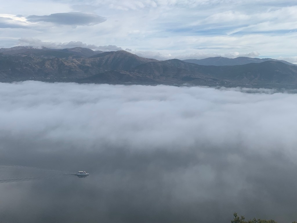 I couldn’t have chosen a better time to walk up to the top of Kastoria Hill than 9 am this morning. The overnight mist lying on the lake was just lifting, and provided some fine sights.