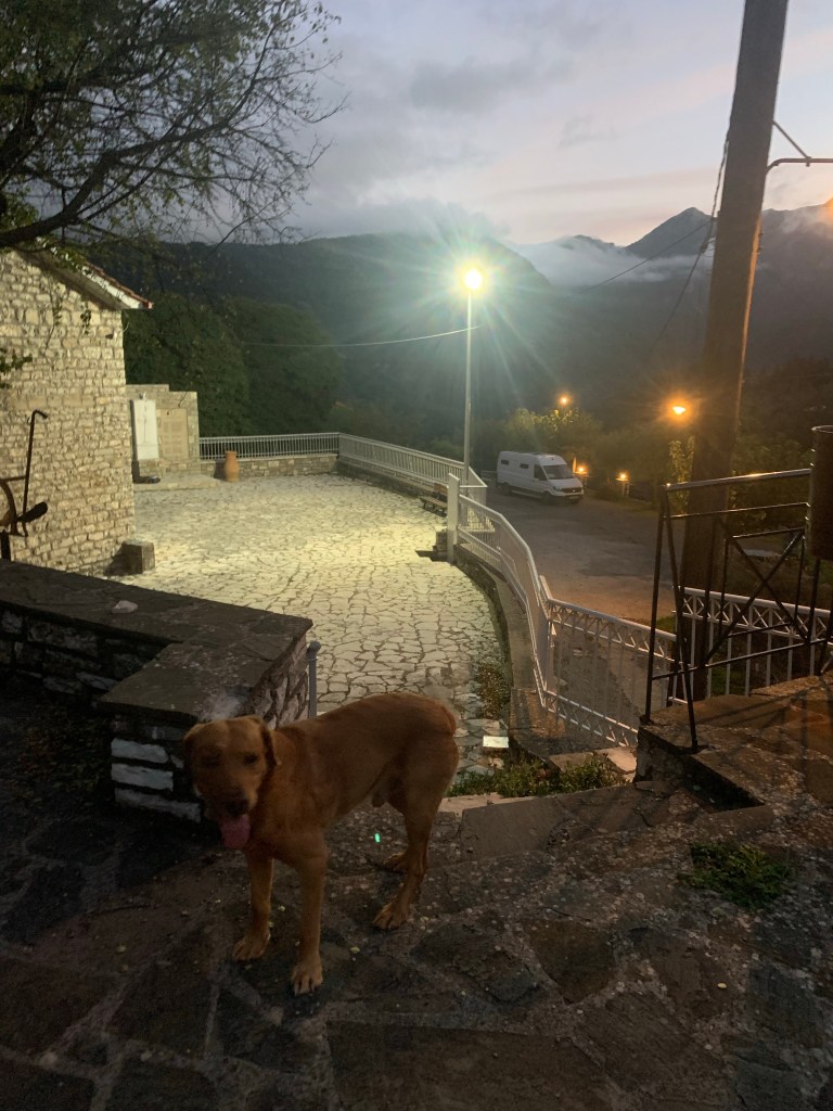 Of the four villages I will visit, this gets the least visitors. The streets are too narrow to park on, but there is a small car park behind the church, where I am. There’s one taverna, next to the church. I wandered the village just as dusk arrived, and put my head in the taverna, but there was nothing but a blaring TV. I will visit for coffee tomorrow.