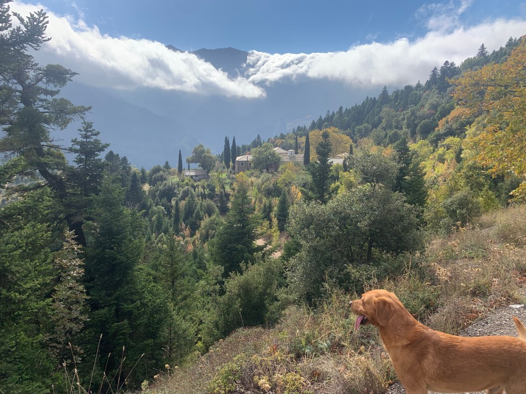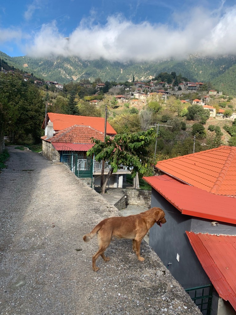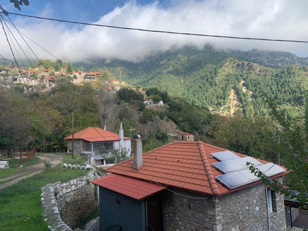 Eventually, at about 3 pm, we arrived at Ambelakiotissa. There are 55 villages that make up the region’s hinterland (Oreini Nafpaktia in Greek), the smaller group, 15 of them, in the mountains, are known as Kravara. Most of the villages have about 100 inhabitants. It’s about a 3 hour drive from Athens, so holiday homes are common. Here in Ambelakiotissa, they are about two thirds of the village.