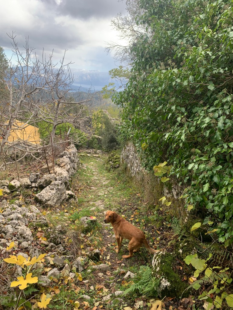 We got out though each morning, even for a few hours on Sunday, following tracks that took us a couple of hundred metres above the village. By now the sky was clear, and the views across the strait to the now snow capped Peloponnese, the first of the season. Both times we finished at the taverna, Barrolo 16, where we were welcomed as regulars.