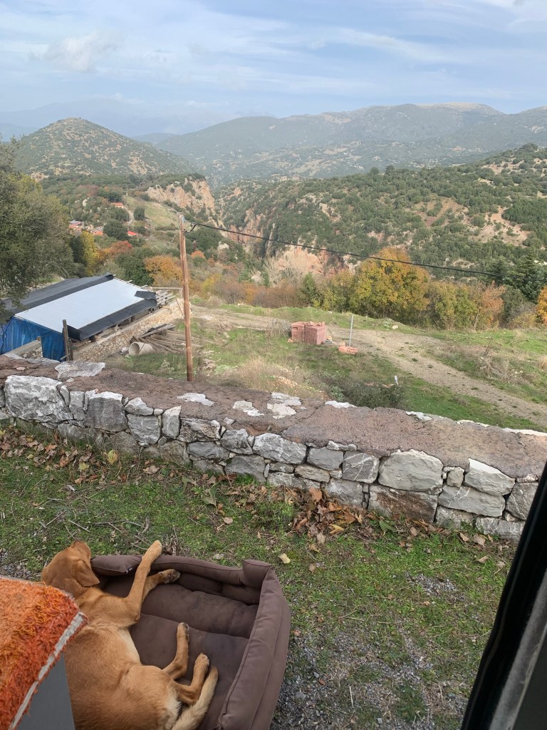 I headed north west, just a quarter of an hour and ten kilometres to the village of Magouliana, the next stage of the Mainalon Trail. I had my eye on a couple of possible stopovers, working on the theory that there would be a lot less weekend traffic here, as it was a much smaller place, just with the one tavern. The first two places I had pre-planned were not suitable, and I moved on a few kilometres to Valtesinika, up at 1140 metres and a bit of a bigger place. Not far out of the village on its north-side is the monastery of Kimiseos, set above the road with plenty of space for parking. Fortunately the chief monk, a wizened figure with the expected two-foot long grey beard, was in the courtyard. I asked if I could park and stay over. He indicated they were expecting visitors, and showed me a spot out of the way. I think just two cars have come all day, but I am overlooking a gorge with the high mountains of the northeast Peloponnese behind.