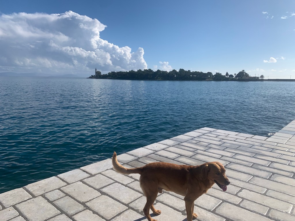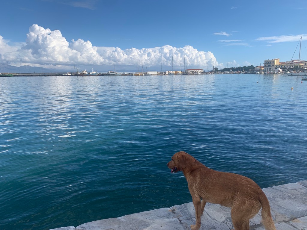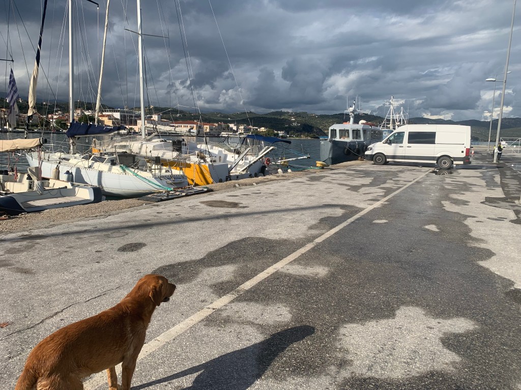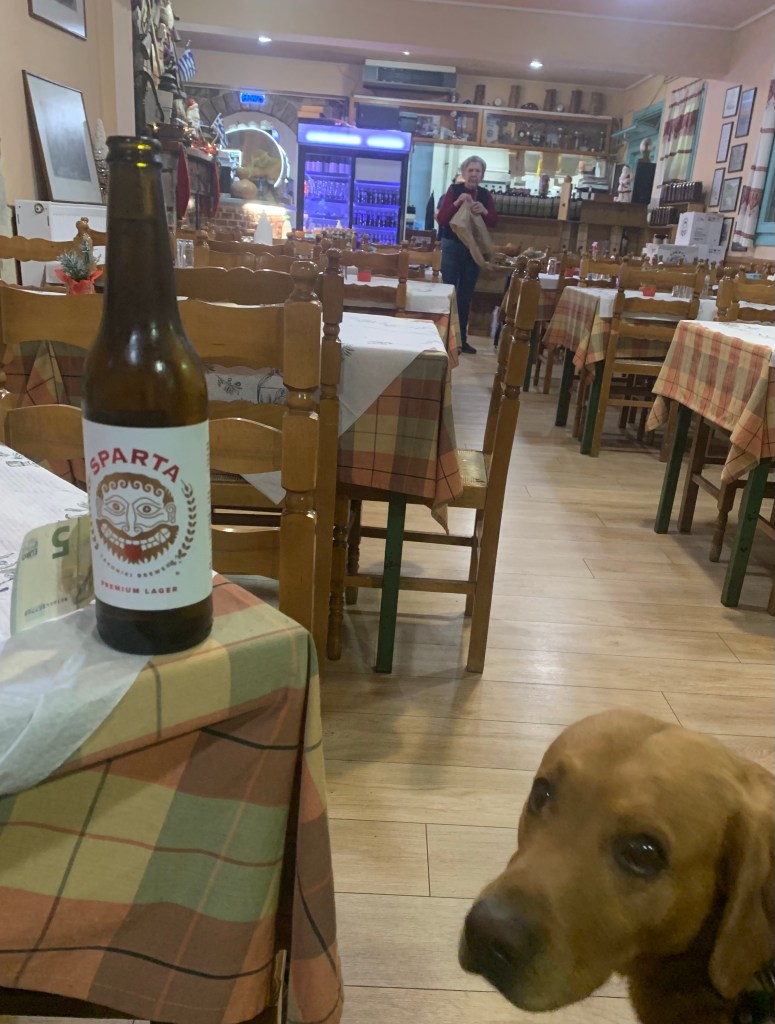 In the early evening Roja relishes a walk into the village for a beer. It’s one of his favourite things. The rain had eased, and I had my eye on a bar on the seafront called The Old School. There seems no set rule here on whether dogs can go inside the bar or tavern, just up to the landlord, as it is in England. In Spain for example, they are never allowed in, and in France, they are always allowed in. In the case of The Old school, the landlord was a dog lover, so Roja was welcomed as he has become accustomed to, with a labrador’s equivalent of a red carpet, a personal salutation and some tapas. It was a welcoming bar for the customer also, though still the choice of beer is remarkably limited, here just being Carlsberg on draught, or bottles of Alpha or Kaiser, two very common Greek beers.