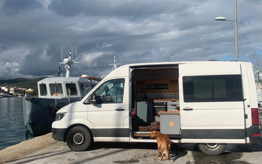 We are parked up for the night at the town of Gythio, on the pier from which ferries run to the island of Kushira. At this time of year, it is a great place to stop. I had expected it to have plenty of other vans, but actually there’s only one, an unoccupied Austrian van whose owners have most likely gone over to Kythira.